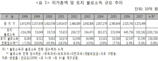 토지소유 편중현상이 이렇게 극심하다 보니 토지에서 발생하는 천문학적 규모의 불로소득 역시 소수의 토지소유자들에게 귀속된다. 아래의 <표 1>를 보면 1998년 이후 남한에서 최근 10년간(1998년~2007년) 발생한 토지 불로소득의 규모가 총 2,002조원이었던 반면, 조세 및 부담금을 통한 환수규모는 총 116조원, 즉 환수비율이 5.8%에 불과한 것을 알 수 있다. 즉 토지에서 발생한 불로소득 2000조의 거의 대부분이 소수의 토지소유자들에게 귀속된 셈이다.