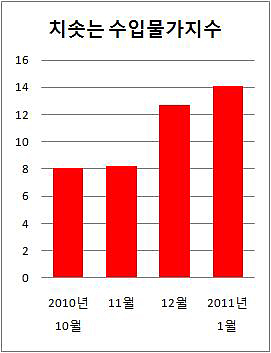 16일 한국은행이 발표한 '2011년 1월 수출입물가지수'를 보면, 국제 원자재값 급등으로 인해 지난달 수입물가지수가 작년 같은 달보다 14.1% 올랐다. 이는 지난 2009년 2월(18.0%) 이후 1년 11개월 만에 가장 높은 수준이다.