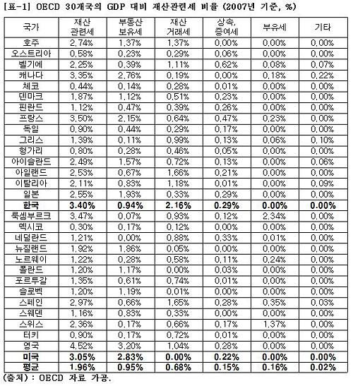 [표-1]에 따르면 2007년 우리나라의 GDP 대비 재산관련세 비율은 3.4%로 OECD 평균 1.96%에 비해 1.7배 높다. 물론 최근 이명박 정부가 부동산 관련세 감세를 추진했기 때문에 이 비율은 낮아졌을 것이다. 그러나 이런 점을 고려한다 하더라도 우리나라 비율이 여전히 OECD 평균보다는 더 높다.