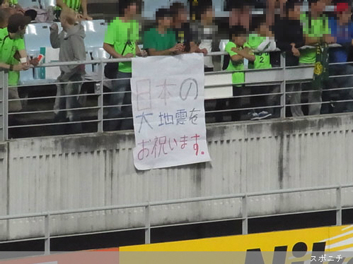28일 일본의 <스포니치> 등에 따르면, 지난 27일 저녁 전주월드컵경기장에서 열린 전북 현대 모터스와 세레소 오사카의 아시아챔피언스리그 8강 2차전(전북 6대 1 승)에서 한 관중이 일본어로 "일본의 대지진을 축하한다"는 내용의 현수막을 스탠드 상단에 걸었다.