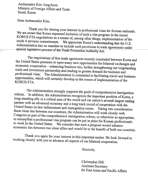 협상 체결 후인 2007년 7월 5일 한·미 FTA 특위에서 당시 김종훈 본부장(당시 수석대표)은 "(전문직 비자쿼터가) 상당히 깊이 있게 논의됐다. 미국 행정부는 여러 채널을 통해 측면에서 지원하겠다는 약속도 했다"며 "다만 이 문제가 공개적으로 논의되면 미 의회로부터 오히려 역효과가 날 수 있다는 얘기를 꼭 덧붙였다"고 답했다.