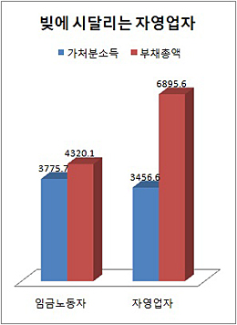 자영업자들의 열악한 호주머니 사정은 통계로도 드러난다. 지난해 통계청과 한국은행, 금융감독원이 공동 조사해 발표한 '가계금융조사'를 보면, 자영업자의 평균 가처분소득은 3457만 원에 머문 반면, 평균 부채는 6896만 원으로 가처분소득의 두 배에 달했다. 임금노동자(1.1배)에 비해 가계부 사정이 극히 나빠, 채무상환이 더 어렵다는 뜻이다.