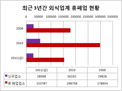 | ▲최근 3년간 신규 등록한 외식업체와 휴·폐업신고한 외식업체. 새로 문을 여는 곳도, 문을 닫는 곳도 늘어나고 있다. ⓒ음식업중앙회 제공 |