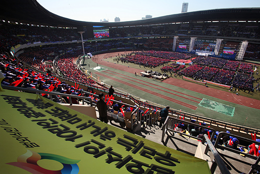 | ▲지난 18일 잠실 주경기장에 모인 전국의 외식업체 관계자들이 카드수수료율 인하를 요구하고 있다. 카드수수료율 문제는, 어쩌면 FTA에 비하면 '소소한' 문제일지도 모른다. ⓒ프레시안(최형락) |