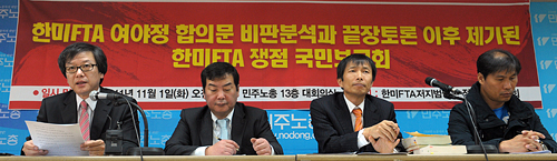 | ▲1일 오전 서울 중구 민주노총 대회의실에서 열린 한미FTA 여야정 합의문 비판분석과 끝장토론 이후 제기된 한미FTA 쟁점 국민보고회에 끝장토론에 참석했던 이해영 한신대 교수, 우석균 보건의료단체연합 정책실장, 송기호 변호사, 이창한 전국농민회총연맹 정책위원장(왼쪽부터)이 발언을 하고 있다. ⓒ뉴시스 |