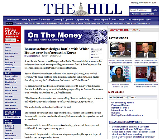 미국 의회전문지 <더 힐(The Hill)>은 지난달 14일자 "보커스 상원의원이 쇠고기의 한국 시장 접근성을 두고 백악관과 신경전을 벌였음을 인정했다"는 기사에서 이와 같은 주장을 보도했다.