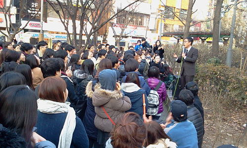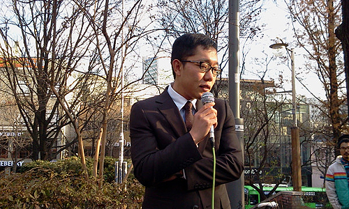 | ▲게릴라콘서트에 나선 김제동 씨. 이날 김 씨의 콘서트 소식은 콘서스 시작 네시간여 전 트위터를 통해 알려졌다. ⓒ프레시안(이명선) |