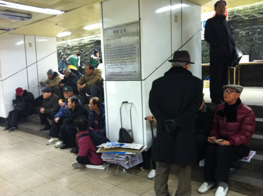 | ▲19일 오후 서울 지하철 종로3가역에 모인 노인들. ⓒ프레시안(김윤나영) |