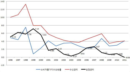 2011년은 아마 한국의 금융사에 역사적인 순간으로 기록될 것이다. OECD에 가입하면서 상식적인 경제정책을 펼치겠다고 한 이후, -0.05%로 1년짜리 정기예금 상품을 기준으로 실질금리가 마이너스가 된 해이다.
