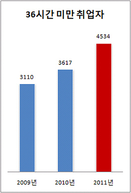 | ▲지난해 늘어난 주당 36시간 미만 취업자수. 단위 : 천명. ⓒ프레시안 |