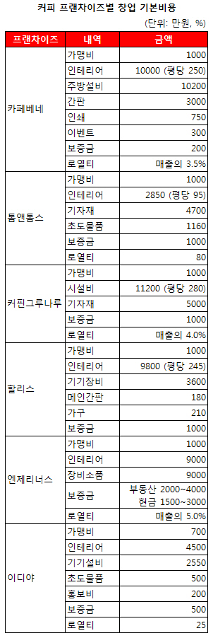 이와 관련, 각 프랜차이즈 회사가 홈페이지에 공개한 기본비용(인테리어비, 가맹비, 간판비 등)은 카페베네와 투썸플레이스가 2억4000~2억5000만 원대, 커핀 그루나루 2억200만 원대, 할리스 1억9300만 원대, 파스쿠치 2억 원대 수준이다. 여기에 임대료와 권리금, 보증금 등도 포함시켜야 한다. 초기 투자금 규모가 결코 적지 않다. 정도의 차이가 있을 뿐, 모든 프랜차이즈 업체가 비슷한 비용집계 방식을 갖고 있다. 비용을 과도하게 청구하는 것 아니냐는 지적이 나오는 이유다.