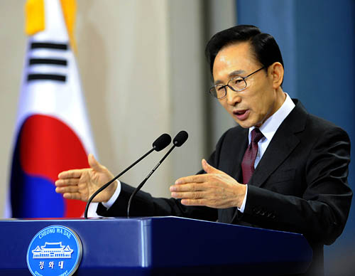 ▲이명박 대통령이 취임 4주년을 사흘 앞둔 지난 22일 오전 청와대 춘추관에서 특별기자회견을 열었다. 이 자리에서 이 대통령은 한미 FTA 발효의 당위성을 강조하며, 야당에 강한 공세를 폈다. ⓒ뉴시스