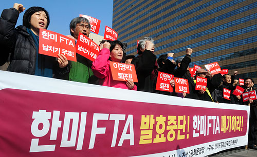 이에 반해 야권의 공세는 단박에 식었다. 민주통합당이 곧바로 의원총회를 소집해 '한·미 FTA 발효 중지 및 전면적 재협상 촉구 결의안'을 냈으나, 이미 먹히지 않는 카드인 '재협상'에 머무는 데 그쳤다. 도리어 이날 의원총회에 한명숙 대표는 모습조차 보이지 않았다. 당 홈페이지에는 민주통합당의 저자세 분위기에 실망한 누리꾼들의 성토가 이어졌다.