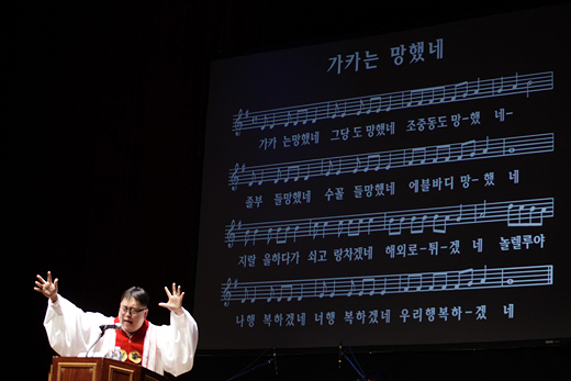 파업콘서트는 <나는 꼼수다>를 통해 이른바 '시사아이돌'로 불리는 시사평론가 김용민 씨의 부흥회 패러디로 시작했다. 김 평론가는 목회자 가정에서 자란 개신교도다. 김 평론가는 특유의 개그로 <국민일보>를 둘러싼 조 목사 가정의 내분과 국민일보 노동조합원들의 파업 정당성을 관객들에게 설명했다.