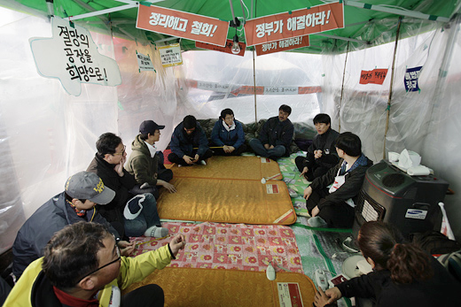곧바로 이들은 회사 앞에 차려진 희망텐트로 향했다. 희망텐트는 지난 2010년 해고노동자 9명이 해고자들의 생계유지와 투쟁기금 마련을 위해 회사 앞에 차렸다. 해고자 중 120여명 정도가 '생계투쟁'을 하면서 투쟁기금을 모으고 있다. 하지만 대부분이 제대로 취업하지 못해 투쟁기금 15만 원을 제 때 내는 조합원은 한 달 30여 명에 불과하다. 김득중 노조 부지부장은 "이력서에 '쌍용자동차'가 들어간 것 자체가 주홍글씨"라며 "한 달에 100만 원 이상 버는 조합원이 소수에 불과하다"고 말했다. 해고자 대부분은 막노동판, 카센터, 정육점 등을 전전하고 있다.