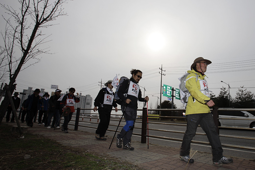 뚜벅이원정단은 지난 12일 전남 해남과 부산광역시에서 출발한 KBS 새노조의 국토 도보순례단이다. 일주일에 닷새, 하루 40㎞가량씩 걷는 이들의 이날 일정은 천안에서 시작해 평택 쌍용자동차 본사 앞 희망텐트에서 끝났다.