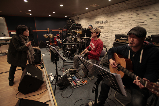 기타 두 대와 베이스기타, 드럼, 키보드로 구성된 풀 밴드 체제의 연습은 이날이 두 번째다. <사계>, <그날이 오면>, <동지를 위하여> 등 합창부분은 쉽게 넘어갔으나 솔로 파트에서는 아직 연주와 보컬이 제대로 어울리지 않는다. 기타리스트 한상원 씨와 부부의 연을 맺은 신지아 동덕여대 실용음악과 강사가 연신 악기와 보컬의 차이에 조화를 주기 위해 연습을 멈춘다.