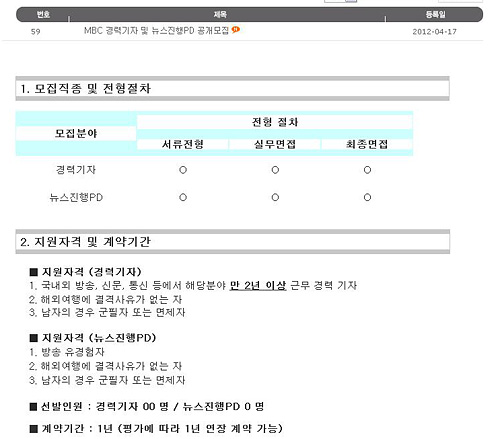 ▲MBC가 낸 계약직 기자 채용 공고. ⓒMBC 채용사이트 스크린캡처.