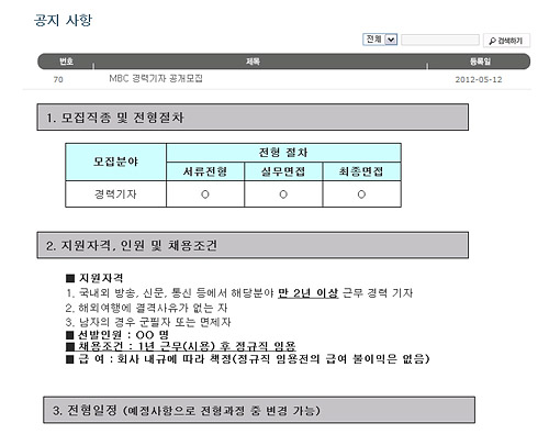 | ▲MBC의 시용기자 모집 공고. ⓒMBC 채용페이지. |