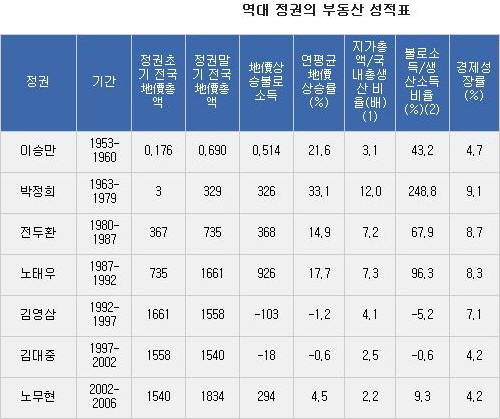 반면 박 후보가 '부동산(가격)이 역대 최고로 폭등했다'고 혹독하게 비판했던 참여정부 시기 연평균 지가 상승률은 고작(?) 4.3%로 박정희 통치 시기와는 아예 비교 자체가 되지 않는다. 국내총생산 대비 지가총액, 생산소득 대비 불로소득의 비율 역시 마찬가지다.