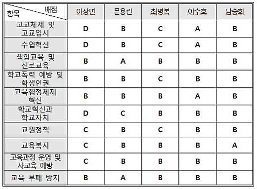 이수호 후보는 '고교체제 및 고교입시'와 '수업혁신', '교육행정체제 혁신' 등 3개 부문에서 A를 받았고, 나머지 7개 부문에서 모두 B를 받았다.