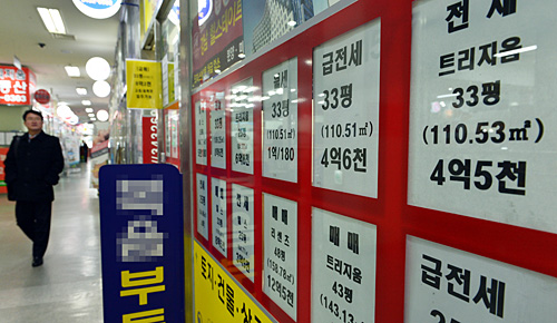 | ▲주택가격 하락세가 지속되는 반면, 전세가 상승세는 끊이지 않아 주택 소유자와 세입자 모두 고통이 커지고 있다. 지난해 12월 29일 오후 서울 송파구 잠실의 한 부동산중개업소 밀집 지역에 전세와 매매 시세표가 붙어 있다. ⓒ뉴시스 |