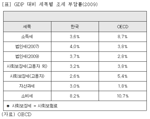 시민경제사회연구소가 OECD 자료를 바탕으로 정리한 통계를 보면, 한국의 GDP 대비 세목별 조세 부담률 중 소득세율 평균은 3.6%로 OECD 평균 8.7%의 절반도 되지 않는다. 고용자 부담 사회보장세율 평균 역시 2.6%로 5.4%인 OECD 평균에 못 미친다.
