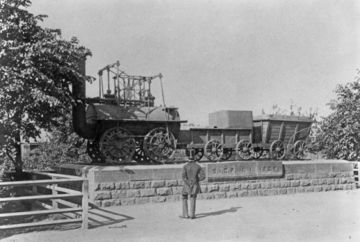 | ▲ 스톡턴-달링턴 노선을 달렸던 기관차 로코모션호와 화차를 재현한 전시 ⓒ위키백과 |