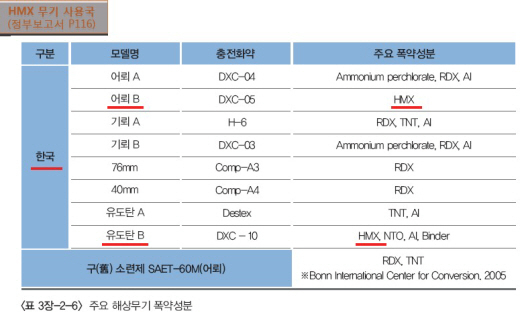 | ▲ 다량 검출된 HMX는 한국 어뢰와 탄약에만 들어가고, 소량 검출된 RDX는 소련을 포함한 거의 모든 어뢰에 들어간다. ⓒ언론 검증위 |
