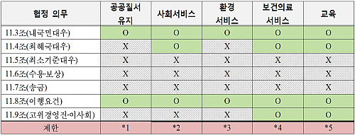 이 표를 통해 한 눈에 알 수 있듯이, 공공 정책에 대한 유보는 ISD 적용 대상이 되는 7가지 의무 중 일부 의무에 대해서만 적용된다. 나머지 의무에 대해서는 유보가 되어 있지 않기 때문에 아무리 공공 정책이라 하더라도, 우리 정부의 조치로 인해 손실을 입었다고 판단하면 미국 투자자는 얼마든지 ISD를 제기할 수 있다. ISD가 공공 정책을 무력화하는 첫 번째 경로는 바로 이곳이다. 그런데 정부의 발표에는 이 부분에 대한 설명이 전혀 없다. 여태까지 정부는 공공 정책이 포괄적으로 유보되어 있다고만 했을 뿐, 유보하지 않은 의무가 있다는 점은 설명한 바가 없다.