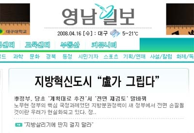 | ▲ 지난달 16일 <영남일보>에는 "지방혁신도시 '盧가 그립다'는 제목의 기사가 실리기도 했다. ⓒ프레시안 |