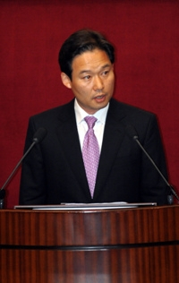 여덟 번째 질문자로 나선 민주노동당 강기갑 의원은 앞선 한승수 총리의 답변 태도가 맘에 안 든다며 호통으로 질문을 시작했다.