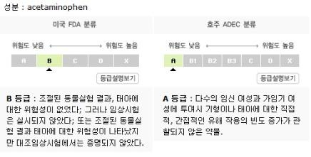 예를 들어 임신 중 써도 안전하다고 알려진 해열진통제인 타이레놀(성분명 : 아세트아미노펜)을 검색하면 왼쪽처럼 '위험도 낮음'이라고 나오지. 이는 태아에게 위험성이 없다고 오랜 세월동안 연구된 약물이라는 뜻으로, 임신부가 비교적 안심하고 쓸 수 있는 약이지.
