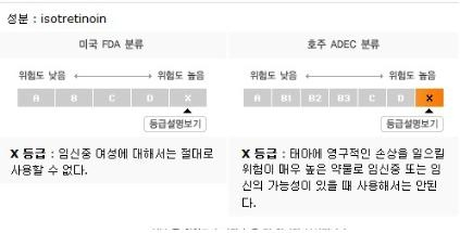하지만 여드름약에 쓰이는 이소트레티노인을 검색하면, 'X등급', 즉 태아에게 영구적인 손상을 일으킬 수 있는 약물로 임신 중에는 절대로 사용해서는 안 된다는 결과가 나오지. D와 X 등급이 나오면 태아에게 이상을 일으킬 위험이 매우 높은 약이기 때문에, 임신 중에는 절대로 피하는 것이 좋지.