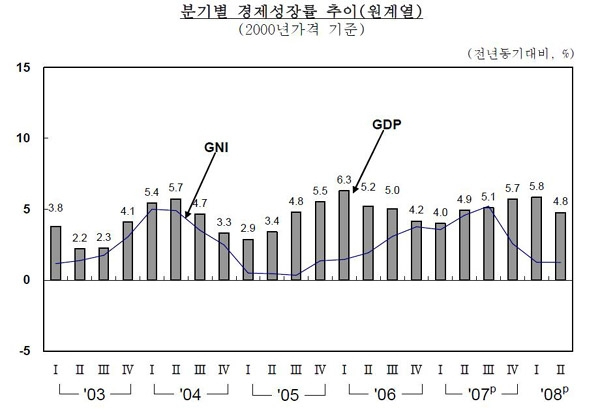 | ▲한국은행이 지난 5일 발표한 분기별 경제성장률 추이. 국민총소득(GNI)이 확연히 떨어진 것을 확인할 수 있다. GNI 감소는 가계의 실질구매력 감소를 뜻한다. 내수부진이 장기화할 수 있다는 우려를 낳는 대목이다. ⓒ한국은행 |