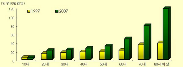'세계 자살의 날'을 하루 앞둔 9일 통계청 발표에 따르면 지난해 자살 사망자는 인구 10만 명 당 24.8명으로 97년 13.0명에 비해 90.7%나 증가했다. 이에 따라 자살은 전체 사망원인 순위에서도 암, 뇌혈관 질환, 심장 질환에 이어 전체 4위를 기록했다. 97년에는 8위였다. 지난해 전체 자살 사망자는 1만2174명으로 전년(2006년)에 비해 1359명 늘어난 수치다.