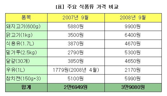 "1년 전에 비해 식료품 가격이 아무리 적게 잡아도 1/4 이상은 더 들어가는 것 같다. 더구나 우유, 식용유, 밀가루, 돼지고기, 라면 등 다른 것으로 대체할 수도 없는 품목들만 골라서 올랐다. 광우병 파동 나면서 쇠고기는 안 먹는다고 쳐도 한창 자라는 얘들한테 돼지고기, 닭고기마저 안 먹일 수는 없지 않냐. 또 최근 멜라민 파동이 나면서 중국산 식품엔 선뜻 손이 가지 않는다."