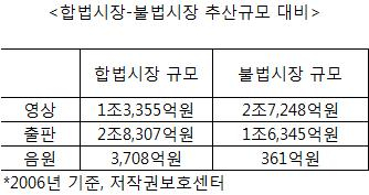통계자료는 수치를 외우는 것보다 해석이 중요하다. 근래의 최대흑자가 경기침체와 수입급감의 결과인 '나쁜 흑자'이고, 부도기업의 감소 역시 이런 맥락에서 읽을 수 있는 것처럼 말이다. 영상 부문의 불법시장이 합법시장의 2배에 달하는 것은 불법다운로드가 부가판권시장을 무력화했다는 증거가 될 수 있다. 파일형태의 콘텐츠 제공에 조심스러운 출판계는 합법시장이 우위를 지키고 있으며, 인터넷을 통한 불법적 이용률도 상대적으로 낮은 편이라 한다. 그런데 음원은? 불법시장이 합법시장의 10분의 1이다. 매우 싼 가격에 제공되는 음원서비스가 불법시장을 흡수한 것이다. 불법시장이 공범이긴 해도 주범은 아니라는 말이다.