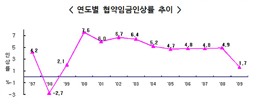 이는 1998년 외환위기 이후 최저 수준이다. 2008년도의 평균 임금인상률 4.9%와 비교하면 무려 3.2%포인트나 떨어진 것이다. 지난 1998년 임금인상률은 -2.7%로 마이너스였고, 2000년 다시 7.6%로 정점을 찍은 뒤, 매년 5~6% 안팎의 인상률을 보였었다.
