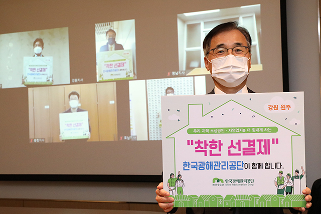 한국광해관리공단(이사장 이청룡)이 코로나19 사회적 거리두기로 생업에 어려움을 겪는 지역 내 자영업자와 소상공인을 위해 ‘착한 선결제’ 캠페인에 나섰다.