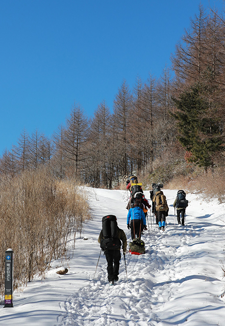 하늘 위로 곧게 뻗은 나무와 어우러지는 눈길을 걸으며 겨울의 정취를 만끽하고, 내리막이 나타나면 막간을 이용해 눈썰매를 즐길 수 있는 것이 이번 챌린지의 묘미다.