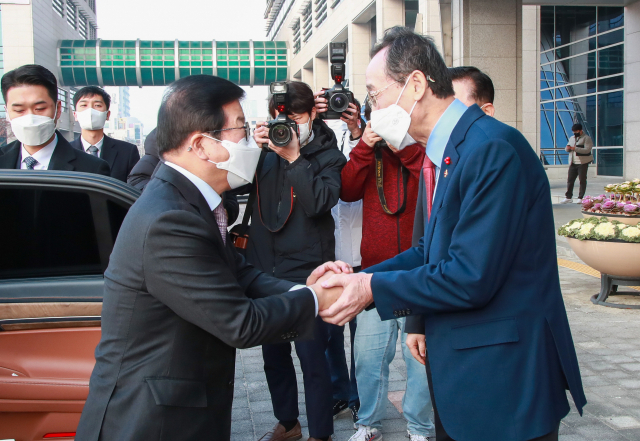 ▲10일 오전 전북도를 방문한 박병석 국회의장이 송하진 전북도지사를 만나 인사를 나누고 있다. ⓒ전북도