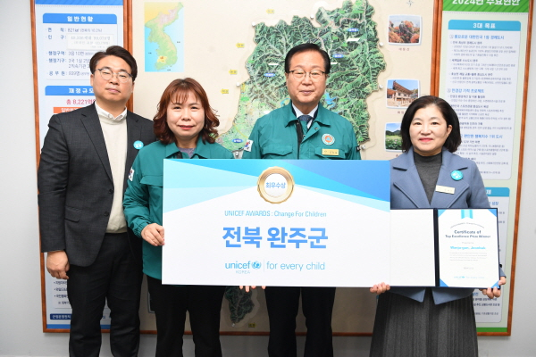 16일 완주군에 따르면 최근 서울 마포구 유니세프한국위원회에서 열린 시상식에서 완주군은 군 단위로는 유일하게 아동친화도시 비전을 지속적으로 실현한 공로를 인정받아 최우수상을 수상했다고 밝혔다.