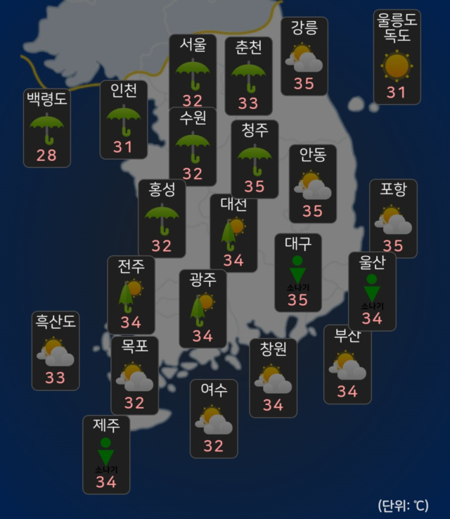 밤사이 기온도 26~30도 안팎으로 떨어지지 않아 열대야가 이어질 전망이다.