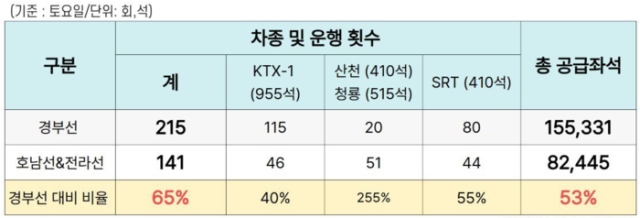 단체가 제시한 자료에 따르면 토요일 기준 경부선은 하루 215회 운행으로 15만5331석을 공급하는 반면 호남선과 전라선은 141회, 8만2445석에 불과하다.