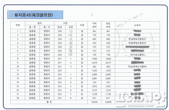 ▲의혹 제기중인 체육시설 중 파크골프장 토지조서.ⓒ기장군
