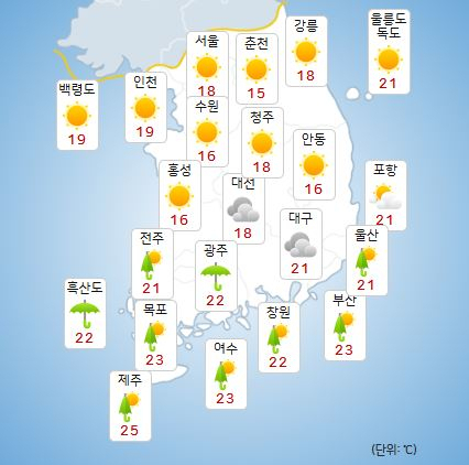 기상청 관계자는 "비가 그친 뒤 맑은 날씨가 이어지겠지만 10도 이상 큰 일교차를 보이는 지역도 있어 건강관리에 유의해야 한다"고 말했다.
