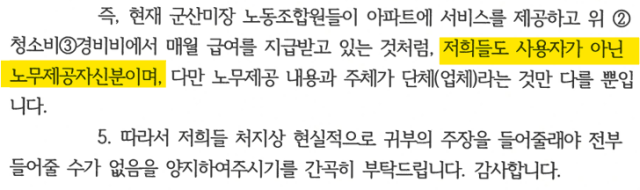 아파트 관리소장도 <프레시안>과 통화에서 “고용 관계 자체는 맞지만 돈 문제, 즉 임금이나 복리후생비 지급은 우리가 책임질 수 없는 부분”이라며 “위탁수수료가 제한돼 있어 관리비 인상 없이는 들어줄 수 없는 구조”라고 말했다. 사실상 고용은 인정하면서도 비용 문제에서는 책임을 회피한 것이다.