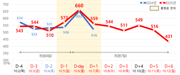 귀성길은 5일(572만 대)부터 본격화돼 6일 정점을 찍은 뒤 7일까지 이어지며 귀경길은 7일부터 시작해 12일까지 길게 분산되는 양상을 보인다.