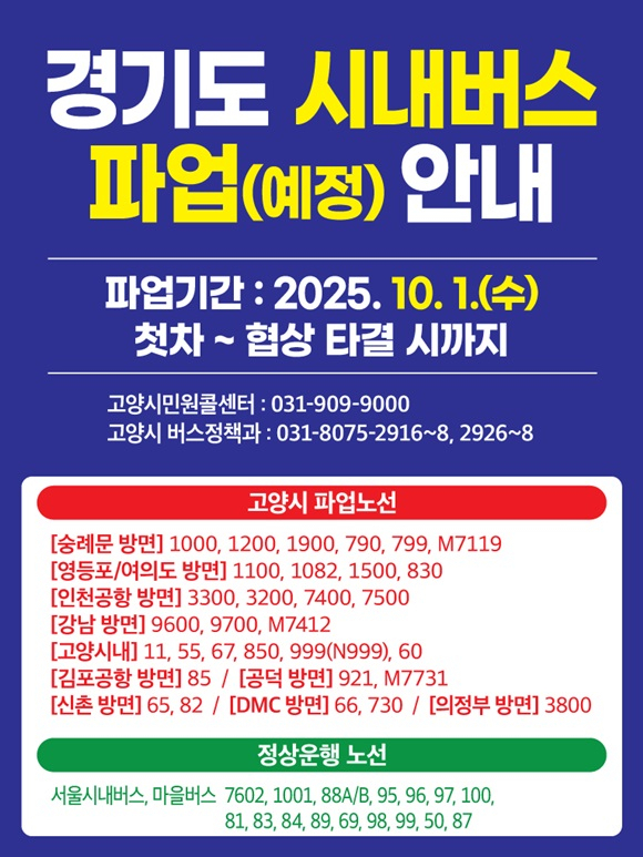 고양특례시는 10월 1일 예고된 경기도 시내버스 총파업에 대비해 비상수송대책을 수립하고, 대체교통수단 확보에 나섰다.